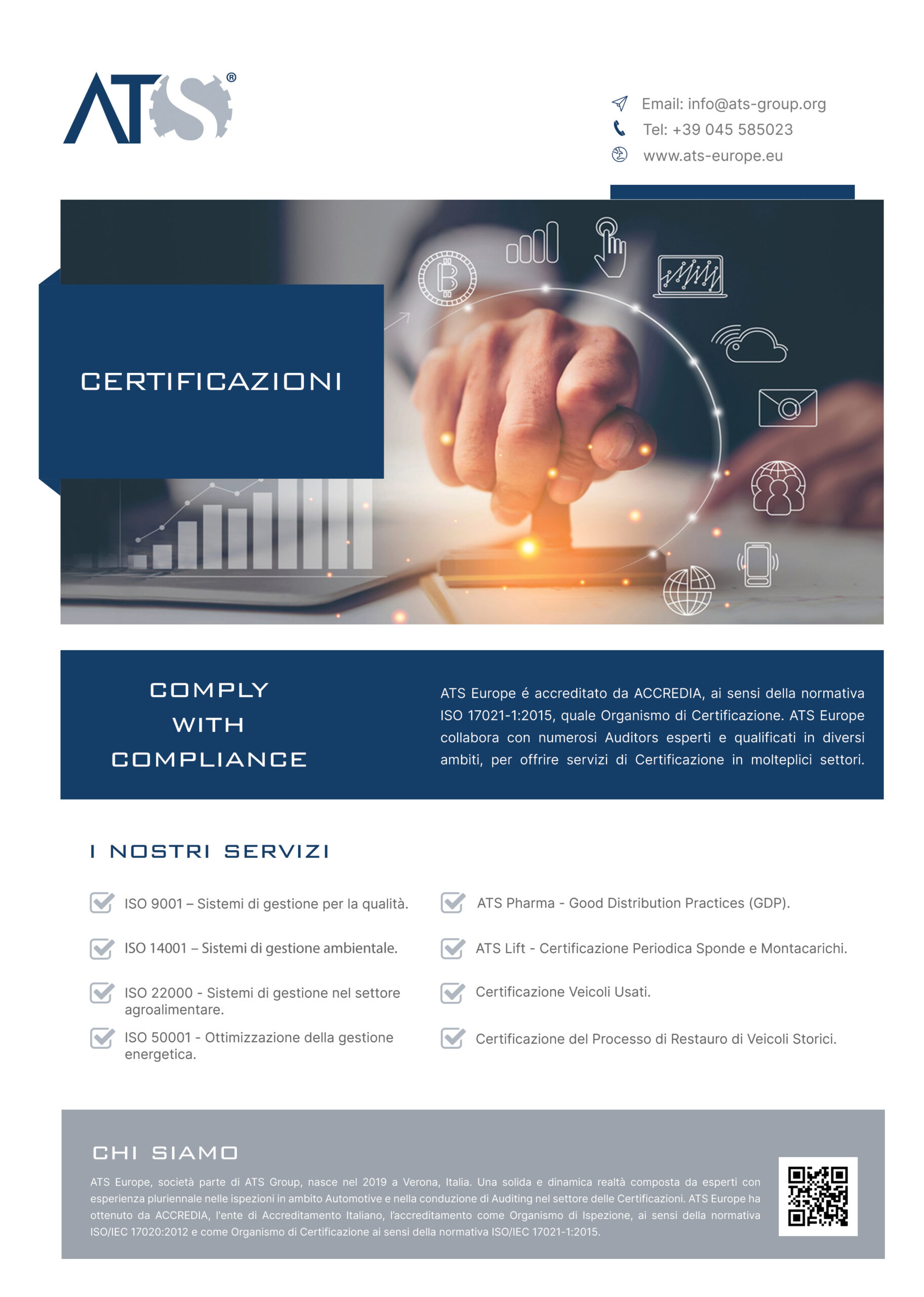 ATS Europe, in quanto Organismo di Certificazione accreditato ai sensi della normativa UNI CEI EN ISO/IEC 17021-1:2015 quale Organismo di Certificazione dei Sistemi di Gestione per la Qualità ai sensi della norma UNI EN ISO 9001:2015, è diventata un azienda leader in materia di certificazioni, al fine di rispondere al meglio alle esigenze dei costruttori e per essere maggiormente allineato con quanto richiesto dalle normative. Attraverso una rete di Auditor esperti e qualificati, di comprovata esperienza nel settore, inseriti in una struttura disponibile e dinamica, ATS Europe assicura competenza e flessibilità nelle attività svolte.